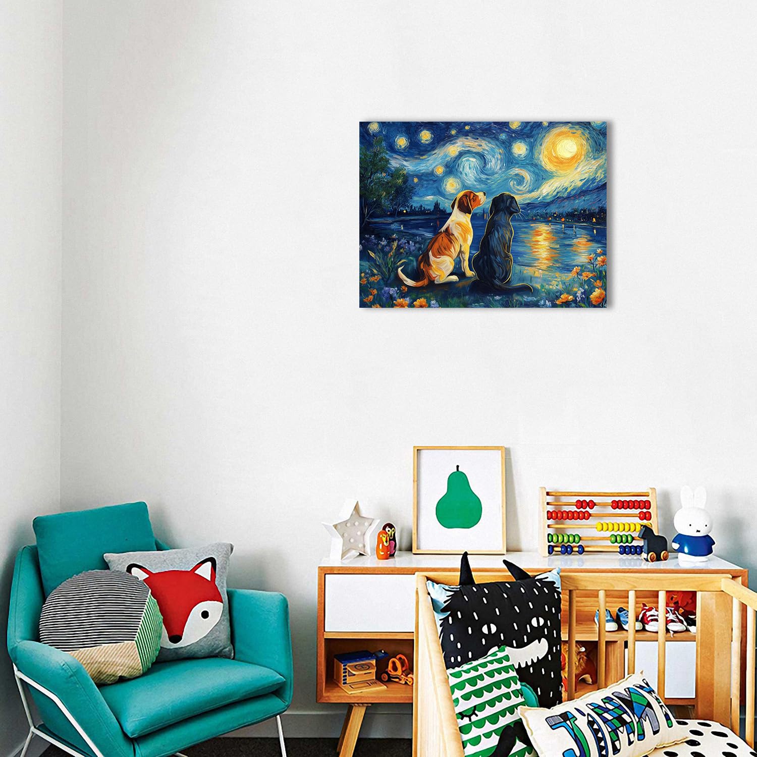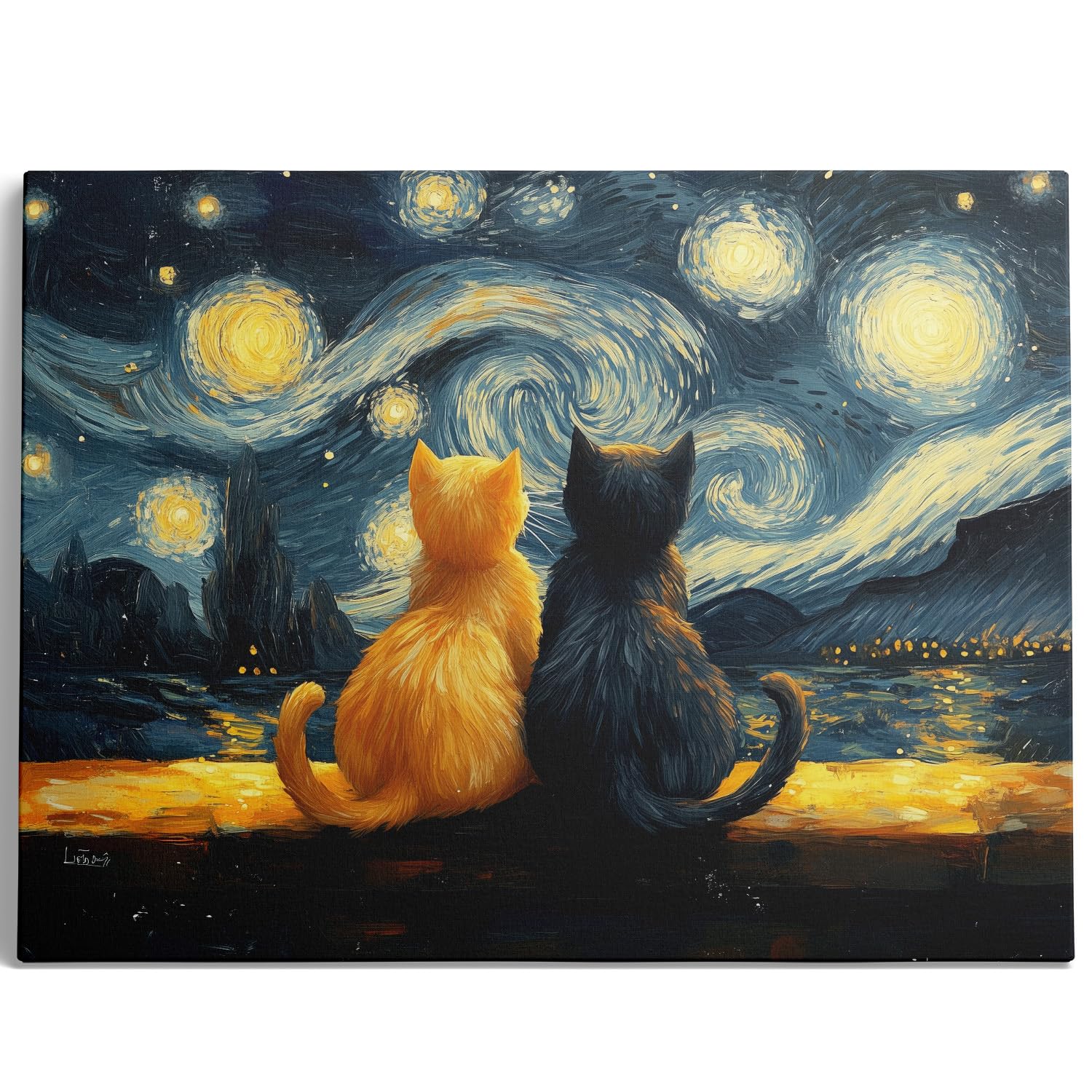 - Artistic Masterpiece: This wall art is a high-quality reproduction of the iconic 'Starry Night' painting by Vincent Van Gogh, featuring two cats admiring the swirling night sky